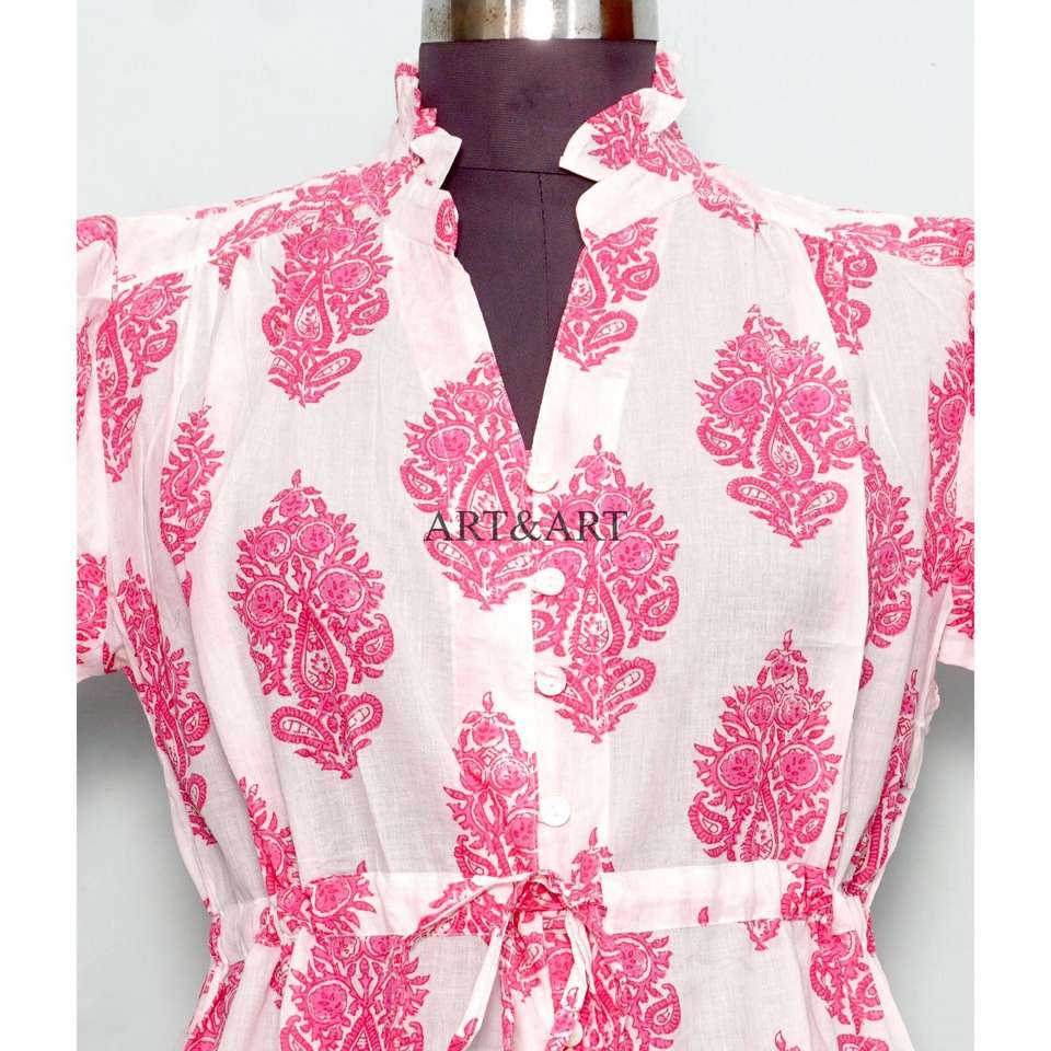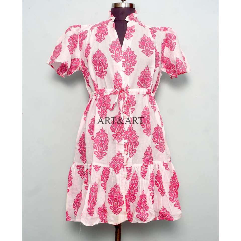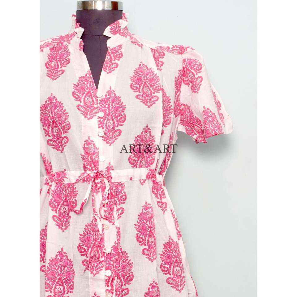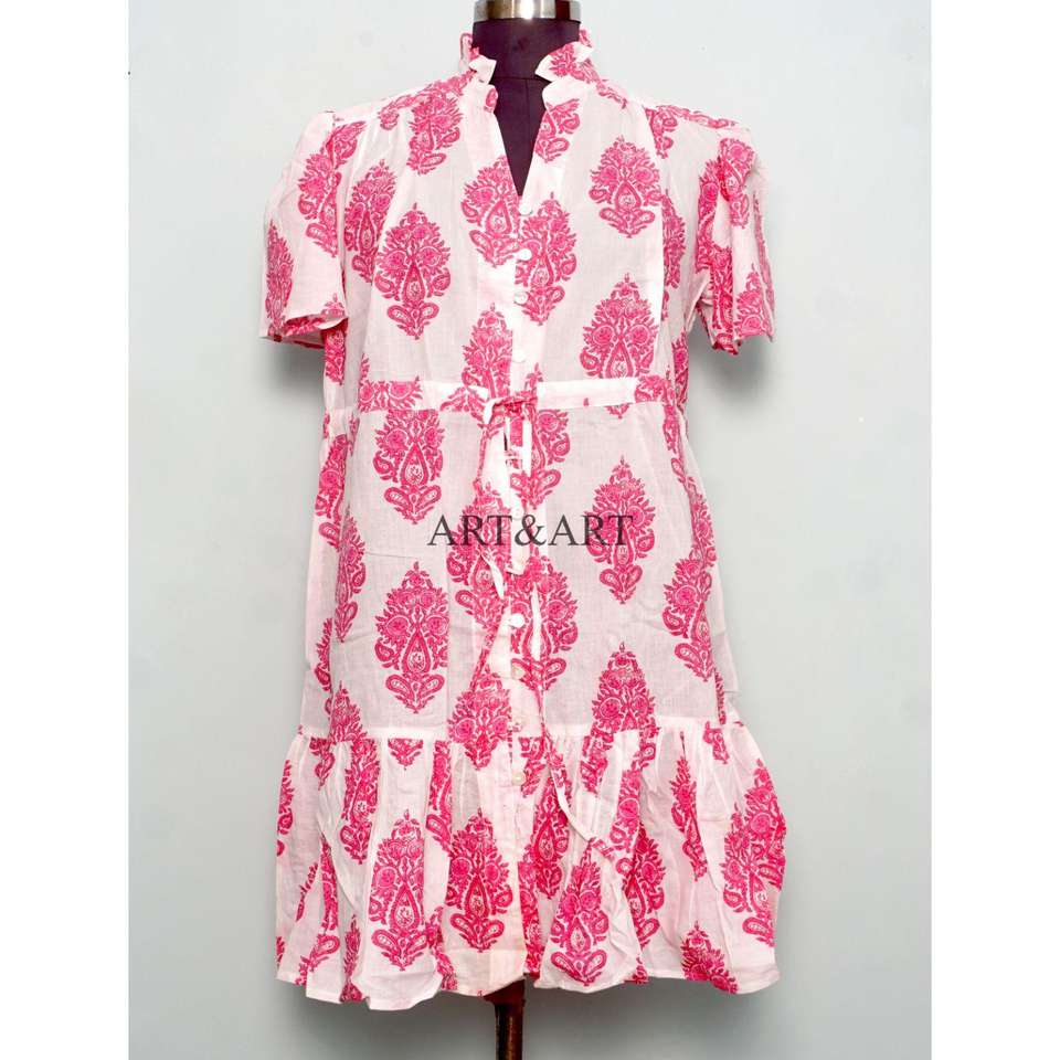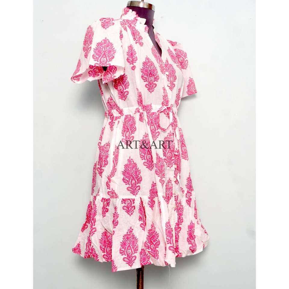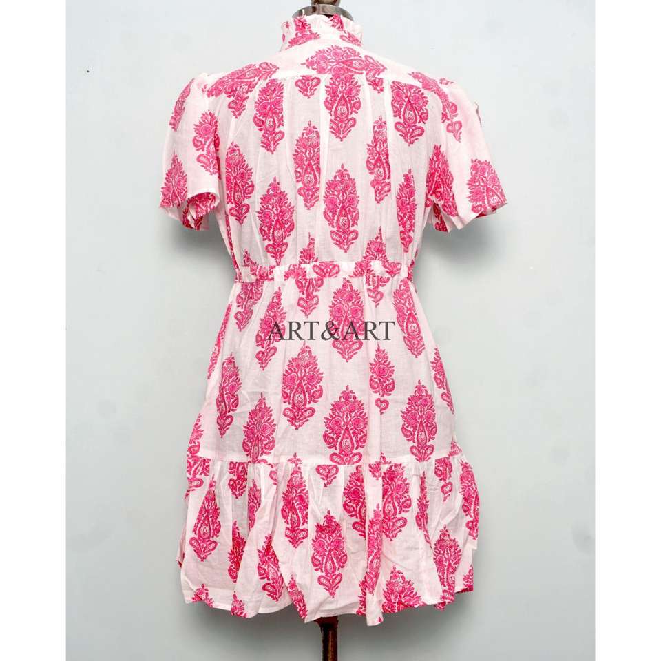 เดรสลำลองฤดูร้อนลายดอกไม้สีชมพูคุณภาพสูง งานแฮนด์เมด สไตล์โบฮีเมียนอินเดีย ผ้าฝ้ายหวานๆ ความยาวปานกลาง สำหรับผู้หญิง