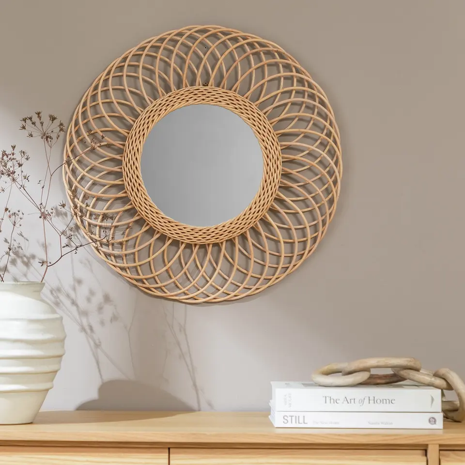 กระจกเงาหวายทรงกลมทำด้วยมือกระจกตกแต่งสไตล์โบโฮสำหรับห้องนอนห้องนั่งเล่น
