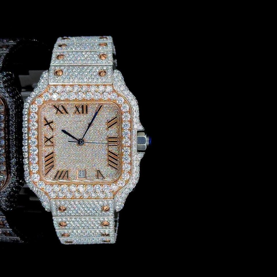 นาฬิกาสแตนเลสสุดหรูสำหรับผู้ชายผู้หญิงทำมือ VVS Moissanite ประดับเพชรเคลื่อนไหวอัตโนมัติ