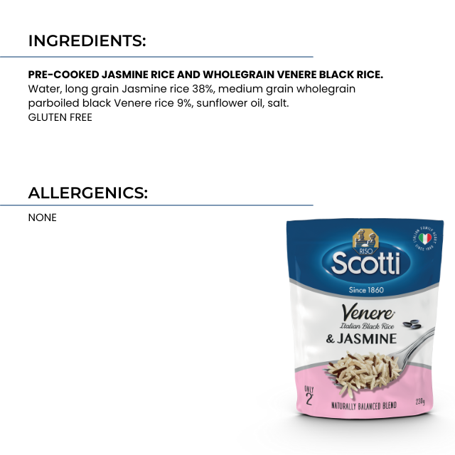 ส่วนผสม:32% ข้าวบาสมาติก, 8% ข้าวสีดำ VENERE, น้ำมันดอกทานตะวัน, เกลือ