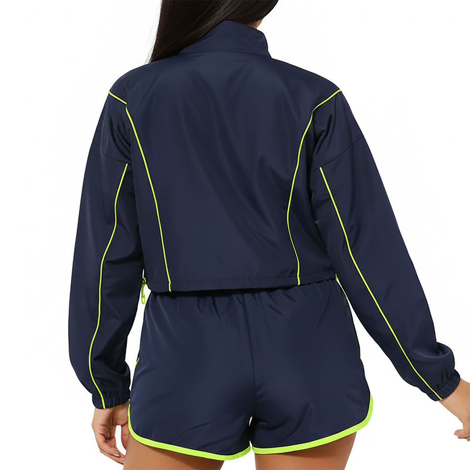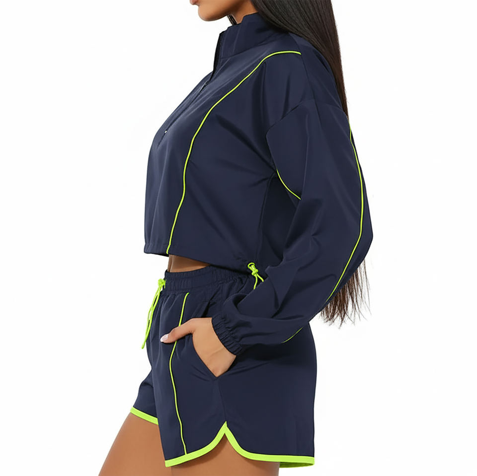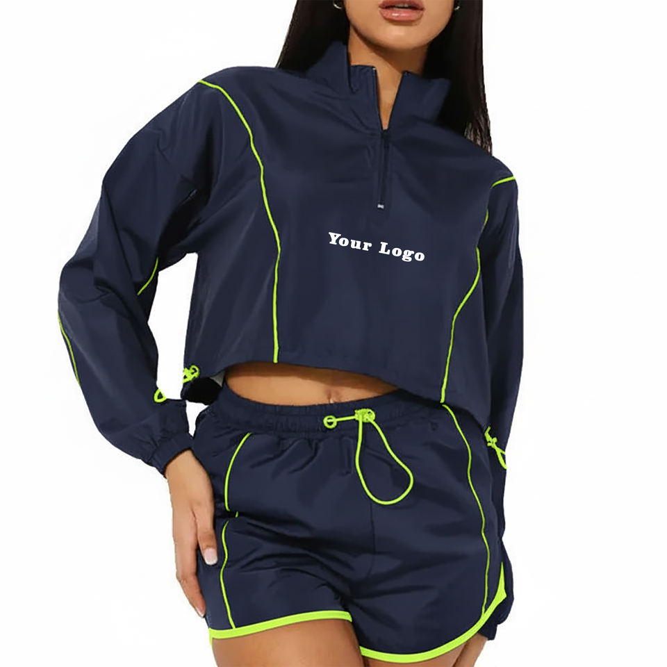 ชุดเซ็ตเสื้อแจ็คเก็ตซิป ¼ ตัวและกางเกงขาสั้นผ้าไนลอนคุณภาพสูง สไตล์ไฮสตรีท ตกแต่งขอบด้วยผ้าทั้งตัว น้ำหนักเบา ชุดลำลอง 2 ชิ้น
