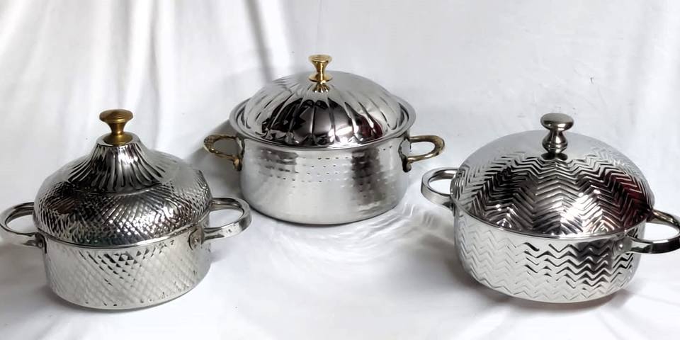 หม้อไฟคุณภาพสูงใช้เป็นเครื่องอุ่นอาหารสีเงินและสีทองมีหลายเล่มเริ่มจากลิตรครึ่ง
