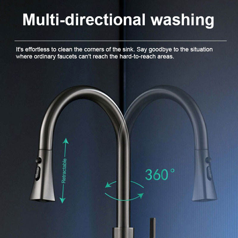 ก๊อกน้ำอ่างล้างจานคุณภาพสูง น้ำร้อน-น้ำเย็น หมุนได้ 360 องศา สีเทาเข้ม พร้อมหัวฉีดแบบดึงออกได้