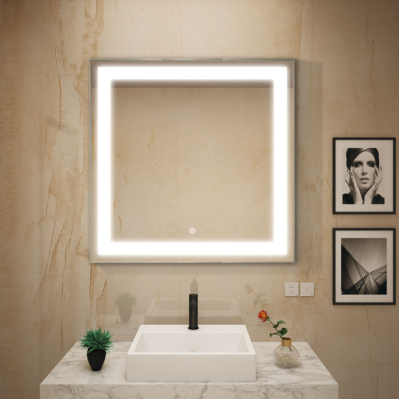 กระจกไฟ LED กันหมอกสำหรับห้องนั่งเล่นโรงแรมสวิตช์สัมผัสแบบไม่สม่ำเสมอกระจกห้องน้ำ