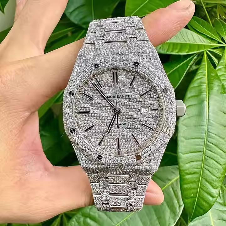 นาฬิกาควอตซ์จักรกลสำหรับผู้ชาย ดีไซน์ทันสมัย ตัวเรือนสแตนเลสและโลหะผสมคุณภาพสูง ประดับเพชรโมอิสซาไนต์ 5 มม. แบบ Iced Out