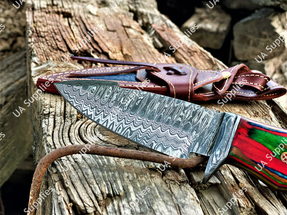 มีดเดินป่าคุณภาพสูง DIY ผลิตจากเหล็กดามัสกัส ใบมีดแบบ Fixed Blade ปลายแหลม สำหรับการเอาตัวรอดและการตั้งแคมป์ ด้ามจับทำจากไม้ Pakka รับผลิตแบบ OEM