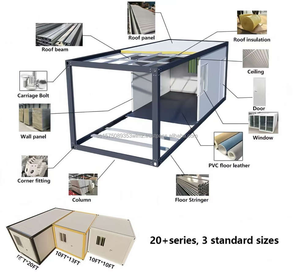 บ้านสำเร็จรูปแบบตู้คอนเทนเนอร์พื้นเรียบคุณภาพสูง พร้อมฉนวนกันความร้อน หน้าต่างอลูมิเนียม โครงสร้างไม้และเหล็ก เหมาะสำหรับใช้เป็นโรงแรม