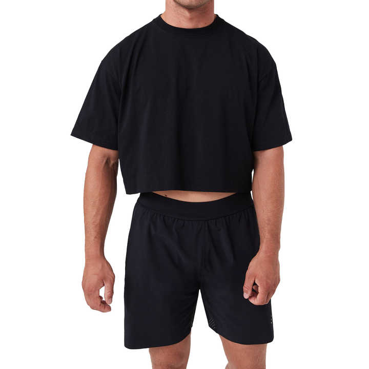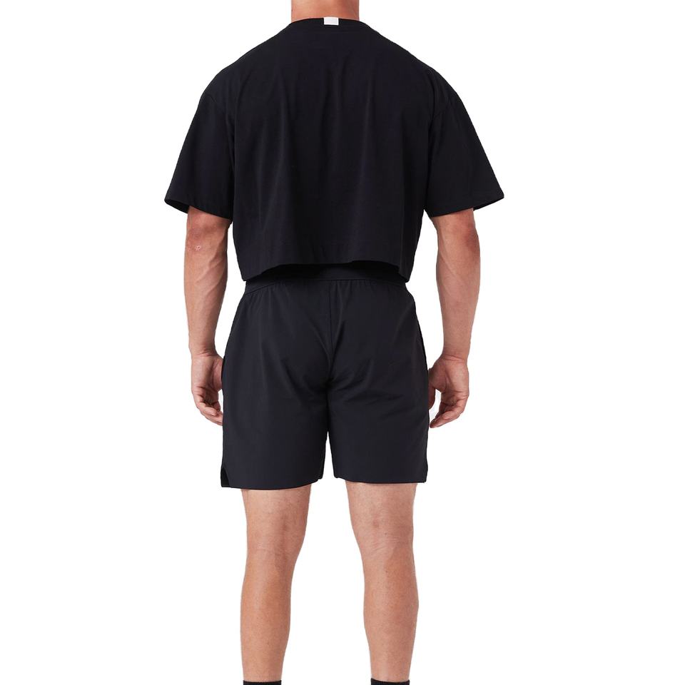 เสื้อยืดครอปสตรีทแวร์ถักคุณภาพสูง สีดำล้วน ทรงหลวม สั่งทำได้ ผ้าฝ้าย 100% ระบายอากาศ แห้งเร็ว สำหรับผู้ชาย