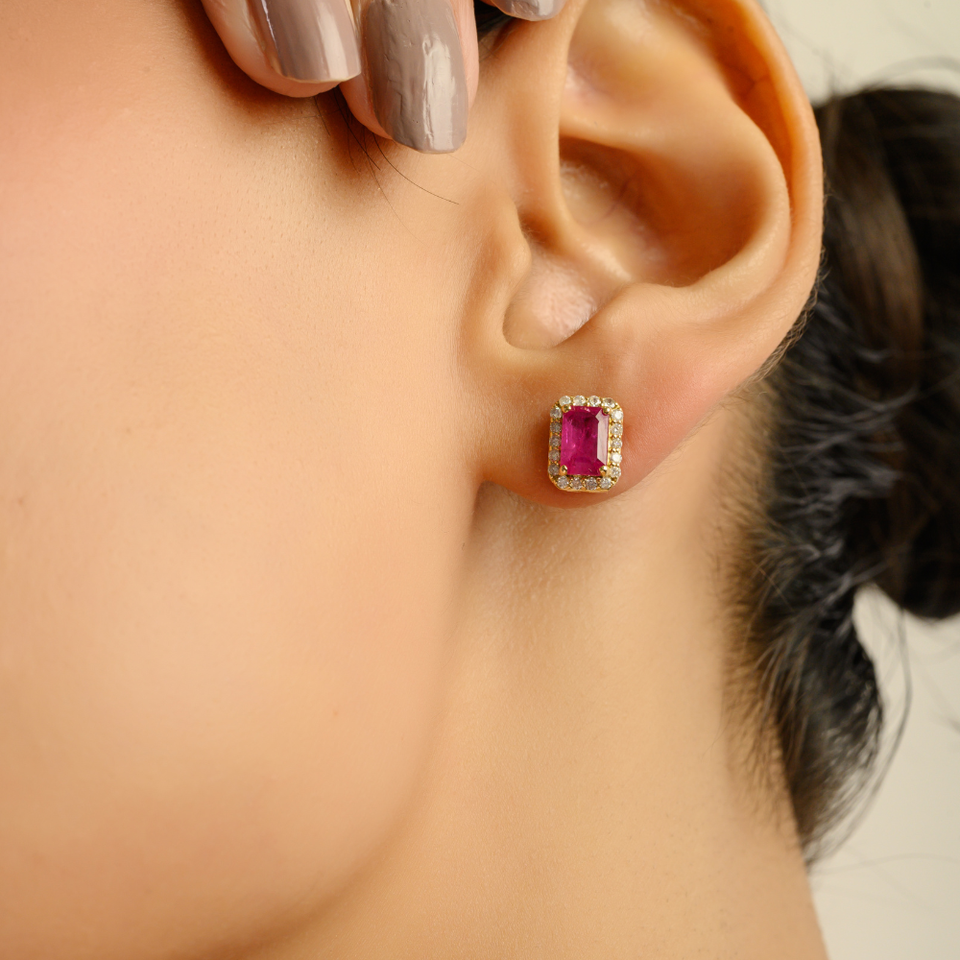 ต่างหูแบบติดหูประดับทับทิมและเพชร 1.21 กะรัต คุณภาพสูง สำหรับผู้หญิง ของขวัญวันครบรอบ ทำจากทองคำแท้ 18K สีเหลือง