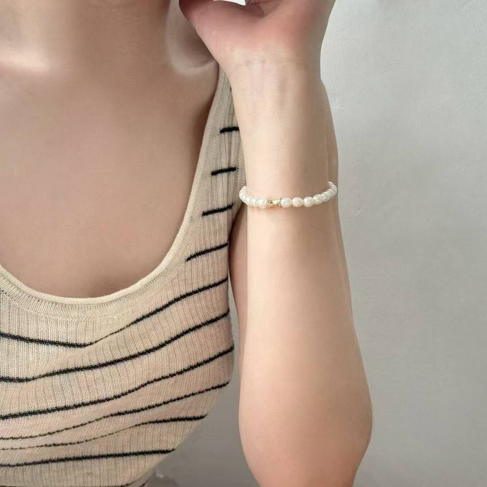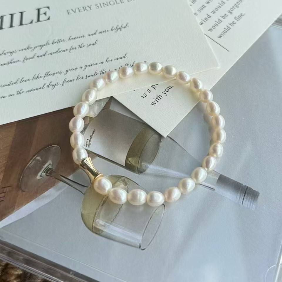 กำไลข้อมือหนังคุณภาพสูง ประดับด้วยไข่มุกน้ำจืดทรงข้าวไร้เมล็ด ขนาด 5-6 มม. ดีไซน์ยืดหยุ่นสำหรับเอวเล็ก