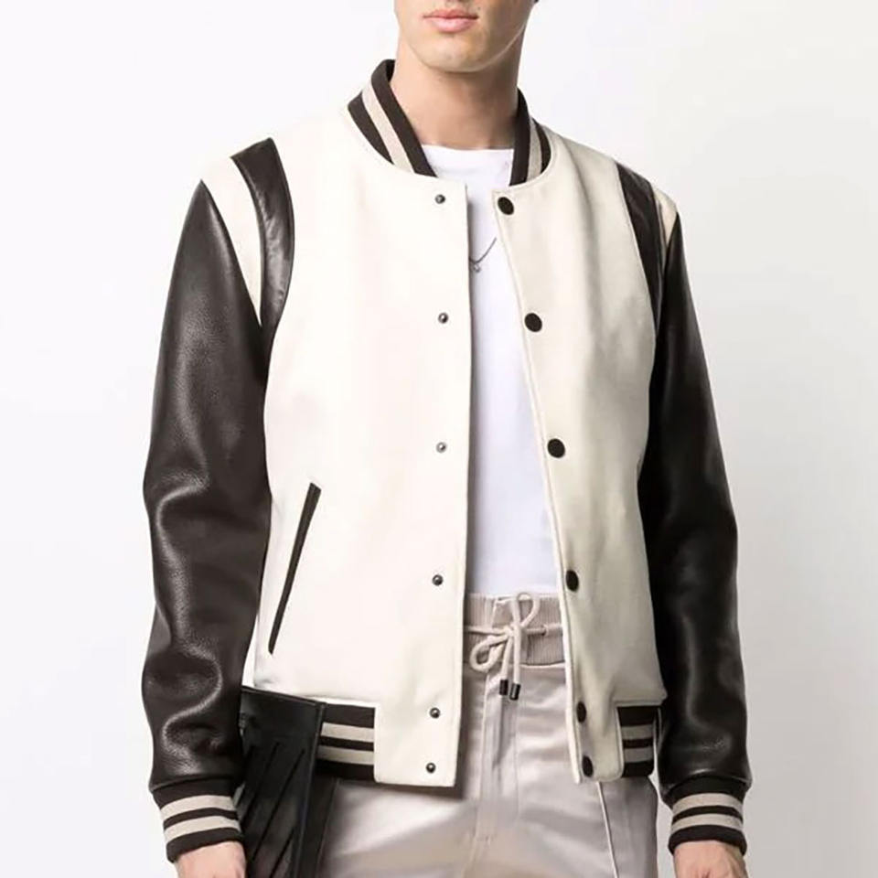 แจ็กเก็ตเลตเตอร์แมนสำหรับผู้ชายเสื้อแจ็คเก็ตหลากหลายสีดำ100% ขนสัตว์แท้สำหรับฤดูหนาวออกแบบได้ตามต้องการ