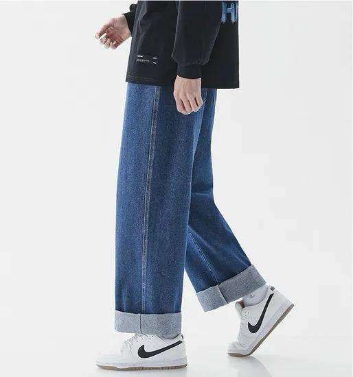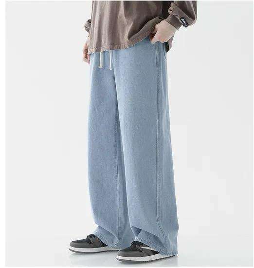 กางเกงยีนส์ผ้าเดนิมสีน้ำเงินน้ำหนักเบาสำหรับผู้ชายกางเกงทรงตรงพร้อมกระดุมตกแต่งสำหรับฤดูหนาวฤดูใบไม้ร่วงฤดูใบไม้ผลิ