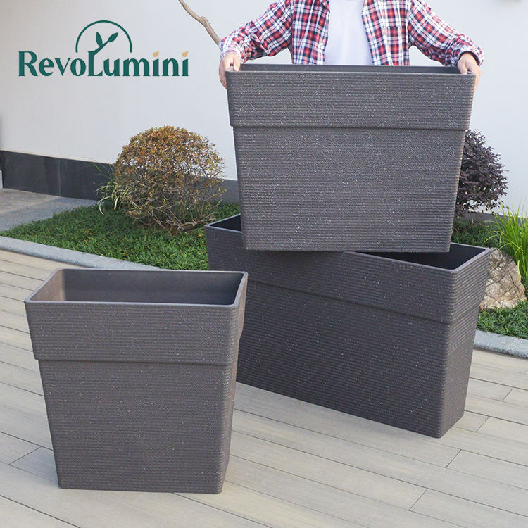 กระถางดอกไม้เรซินทางกลางแจ้งทรงสี่เหลี่ยมขนาดใหญ่น้ำหนักเบาทนทานปลูกต้นไม้ในสวนลายตารางสำหรับห้างสรรพสินค้า