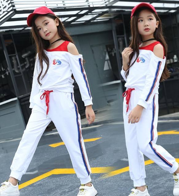ชุดเสื้อผ้าสำหรับเด็กผู้หญิงแนวสปอร์ตเปิดไหล่เฉียงสำหรับฤดูใบไม้ร่วงและฤดูใบไม้ผลิ