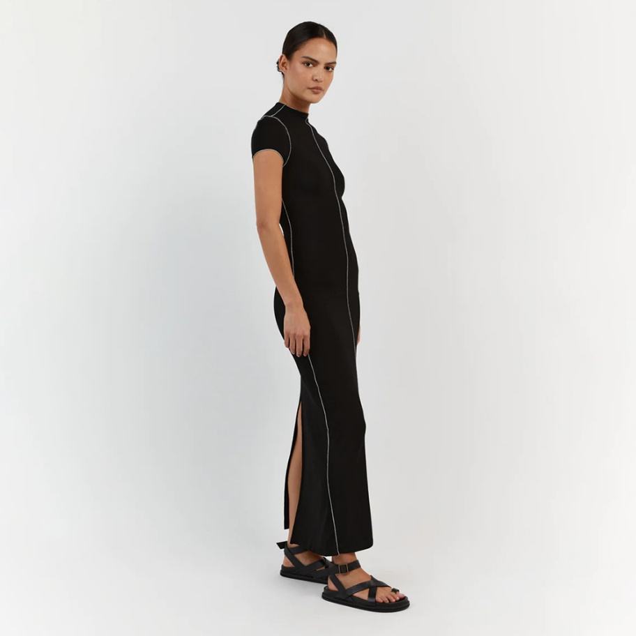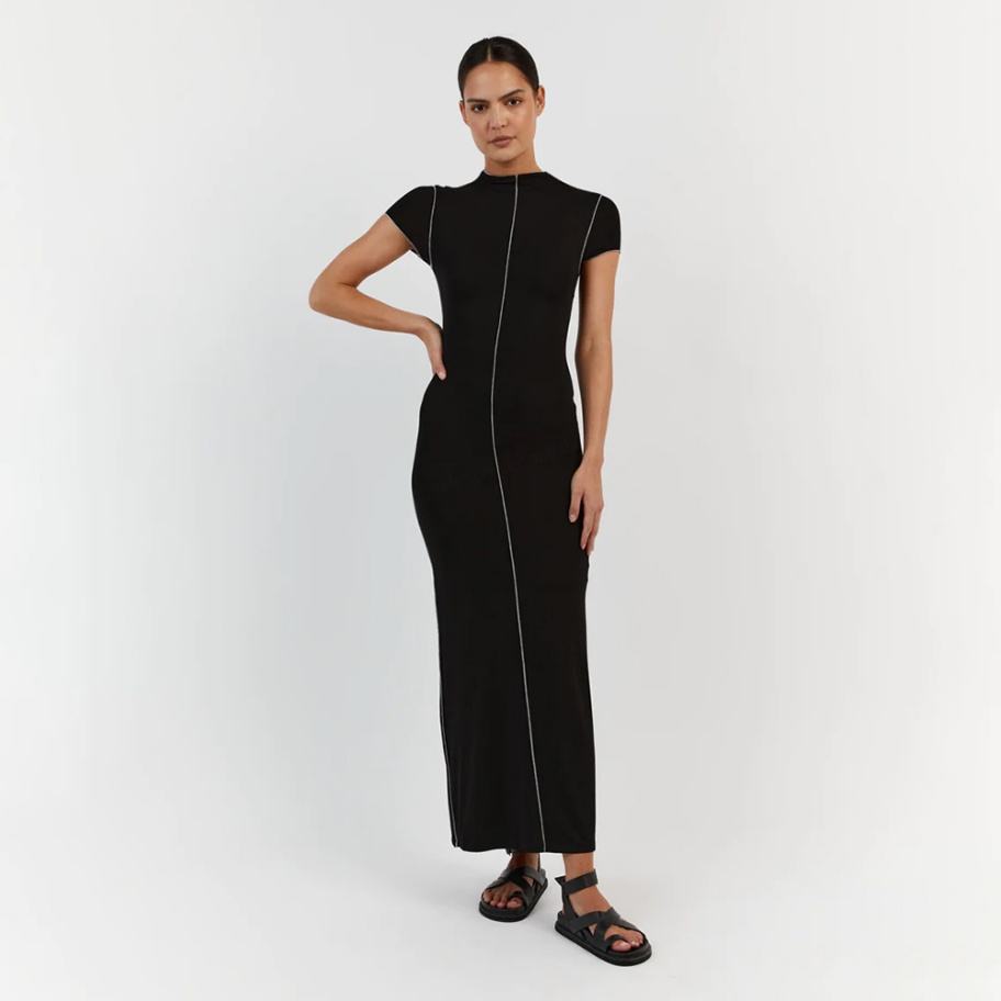 เดรสทรงเข้ารูปคุณภาพสูง ผลิตจากผ้าถักเนื้อนุ่ม ระบายอากาศได้ดี เป็นมิตรต่อสิ่งแวดล้อม แขนสั้น ความยาวปานกลาง สำหรับผู้หญิง