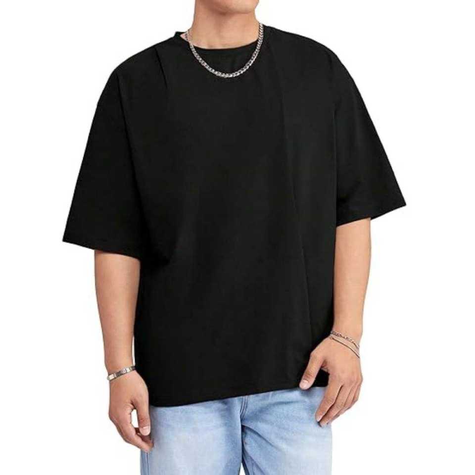 เสื้อยืดแขนครึ่งคอกลมของผู้ชายทรงหลวมสะพายไหล่สีพื้นเสื้อยืดขนาดพลัสไซส์