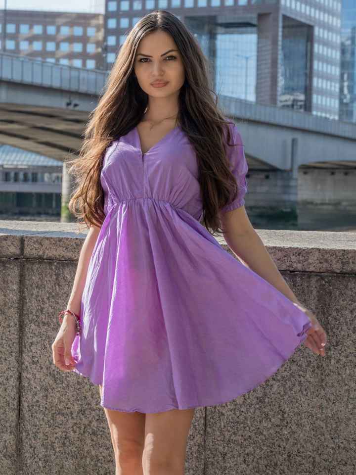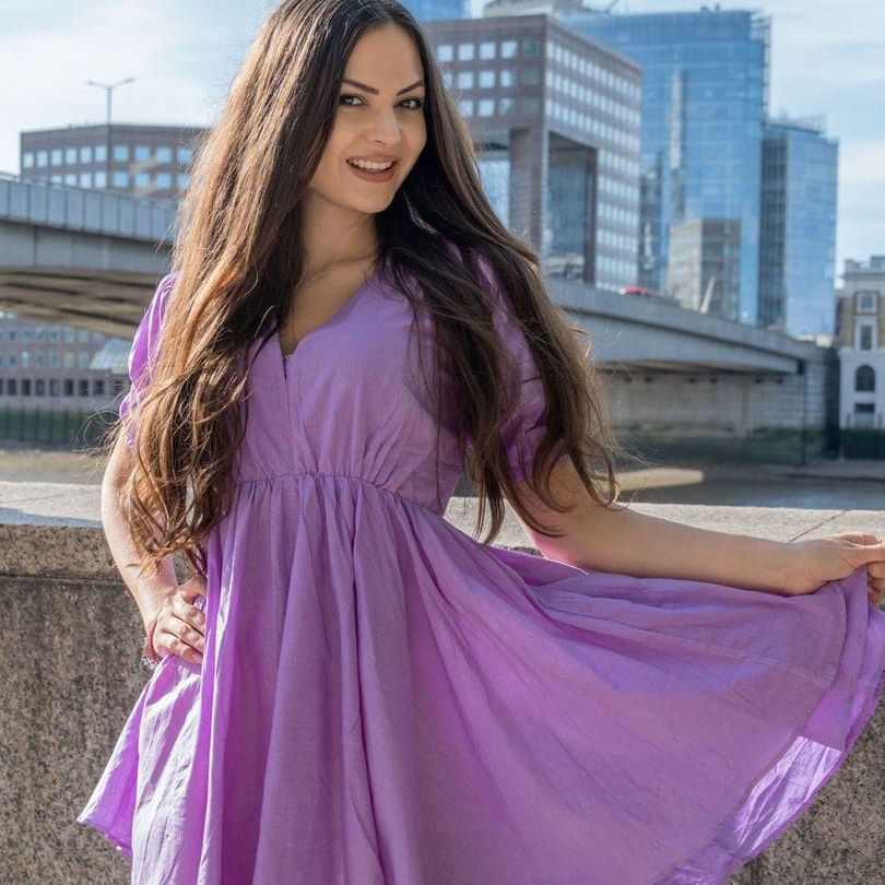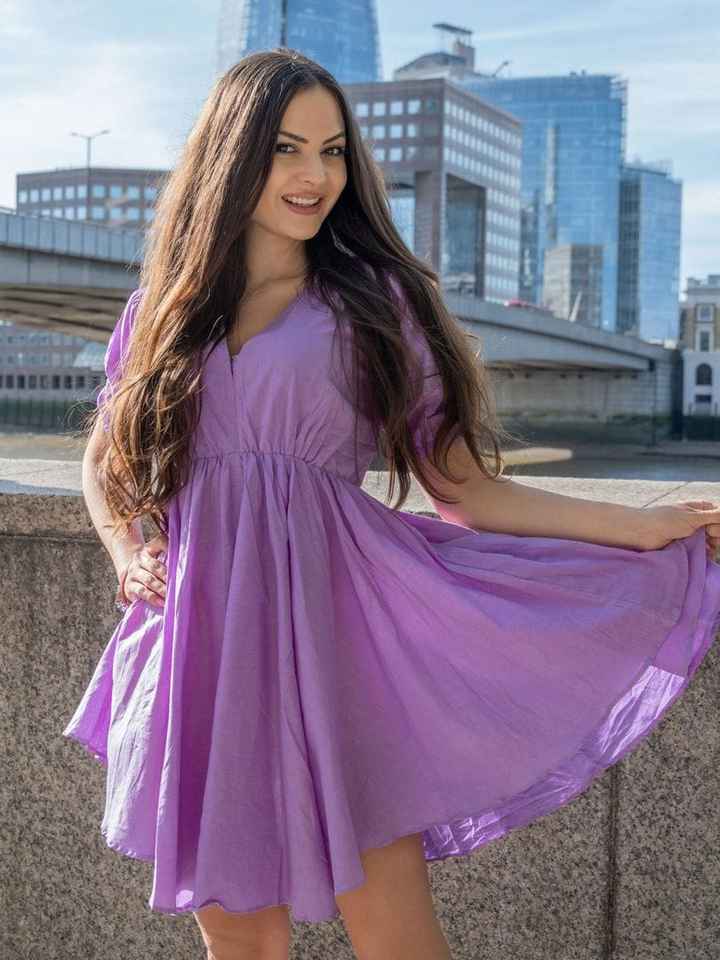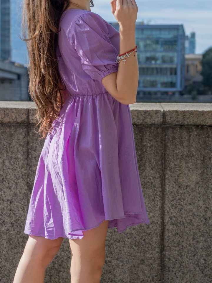 มินิเดรสสั้นเข้ารูปสีลาเวนเดอร์สีล้วนสำหรับผู้หญิงเดรสแม็กซี่ลำลองฤดูร้อน