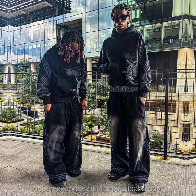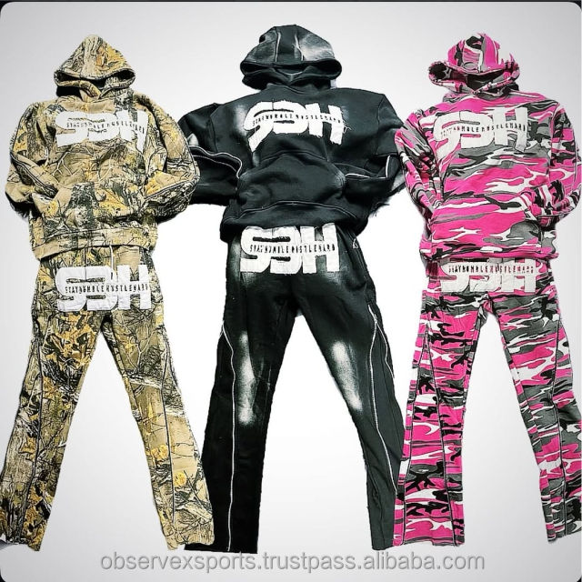 ชุดสตรีทแวร์2ชิ้นสไตล์วินเทจปักลายพรางชุดเสื้อกันเหงื่อมีฮู้ดใส่ได้ทั้งชายและหญิงผ้าฝ้าย100% รุ่นเฮฟวี่เวท