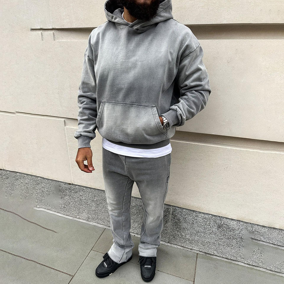 เสื้อมีฮู้ดสำหรับผู้ชายผ้าฟลีซซักซักแบบวินเทจซีดจาง