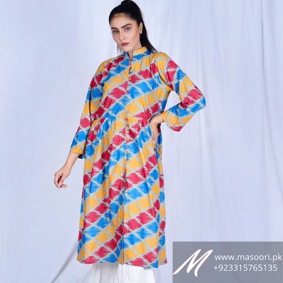 ผ้าลอนพิมพ์ลายดิจิตอลคุณภาพสูง Masoori MP-A087 พร้อมงานปักลาย ดีไซน์คุर्ติแบบยาวสำหรับผู้หญิงสำหรับฤดูร้อน ผลิตในประเทศปากีสถาน