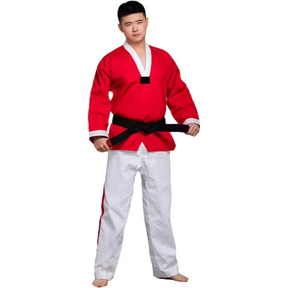 เครื่องแบบเทควันโดสำหรับผู้ชายชุดศิลปะการต่อสู้แบบสั่งตัดสีแดงระบายอากาศได้ดี