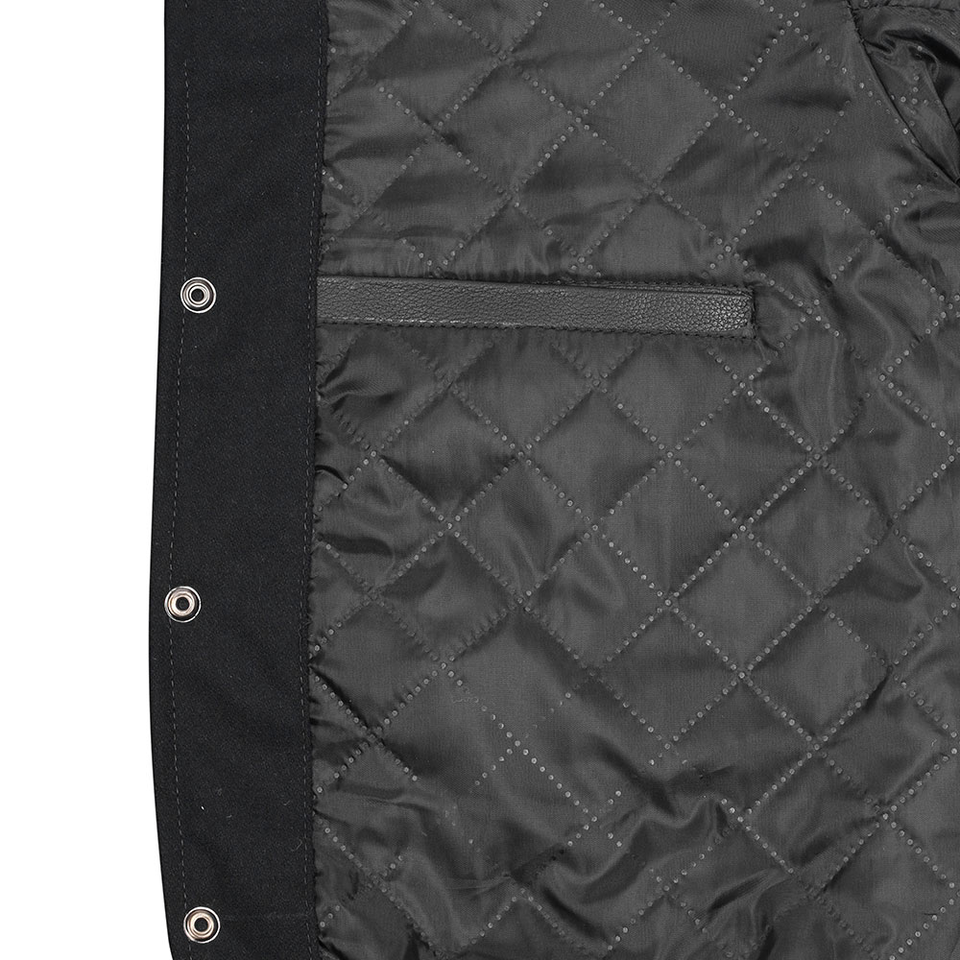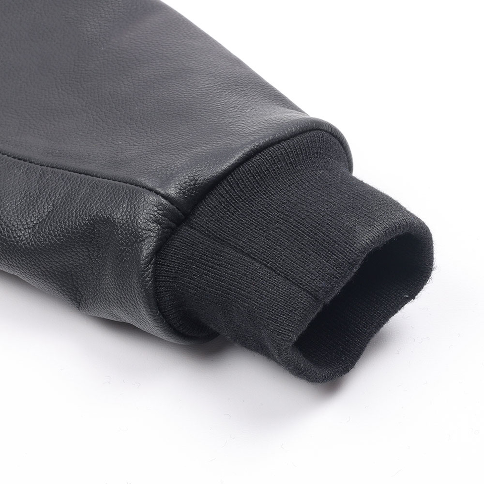 เสื้อแจ็คเก็ตเบสบอลผ้าฟลีซคอตตอนคุณภาพสูงสำหรับผู้ชาย แขนหนังปักลายเชนีล แต่งชายเสื้อแบบริบ หนา น้ำหนักมาก สีดำ สไตล์วาร์ซิตี้