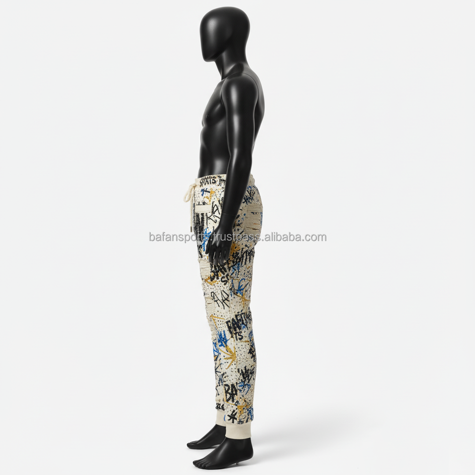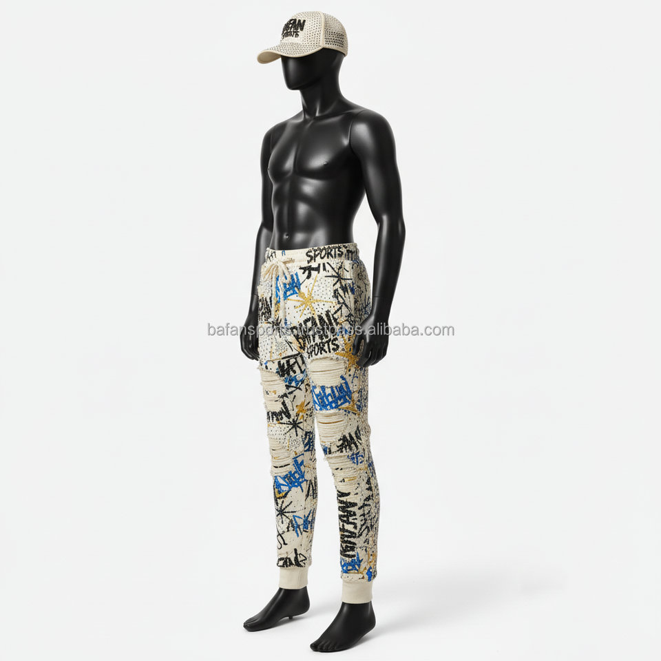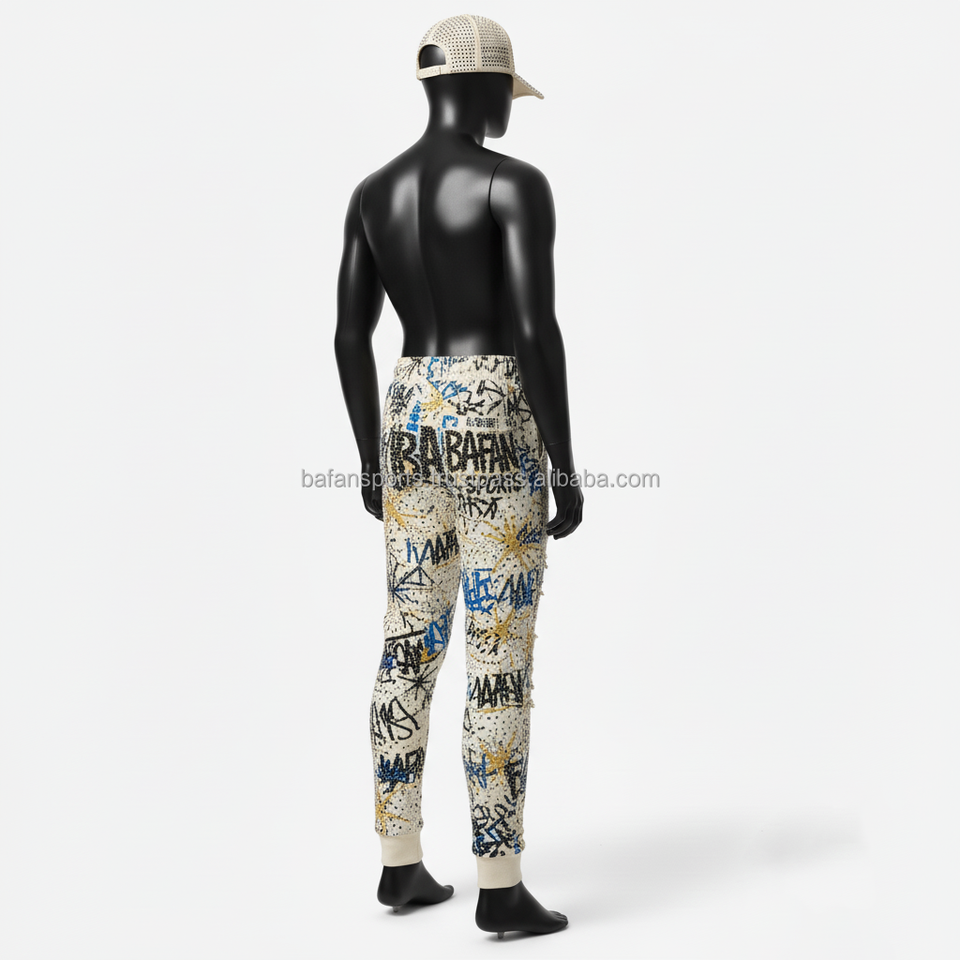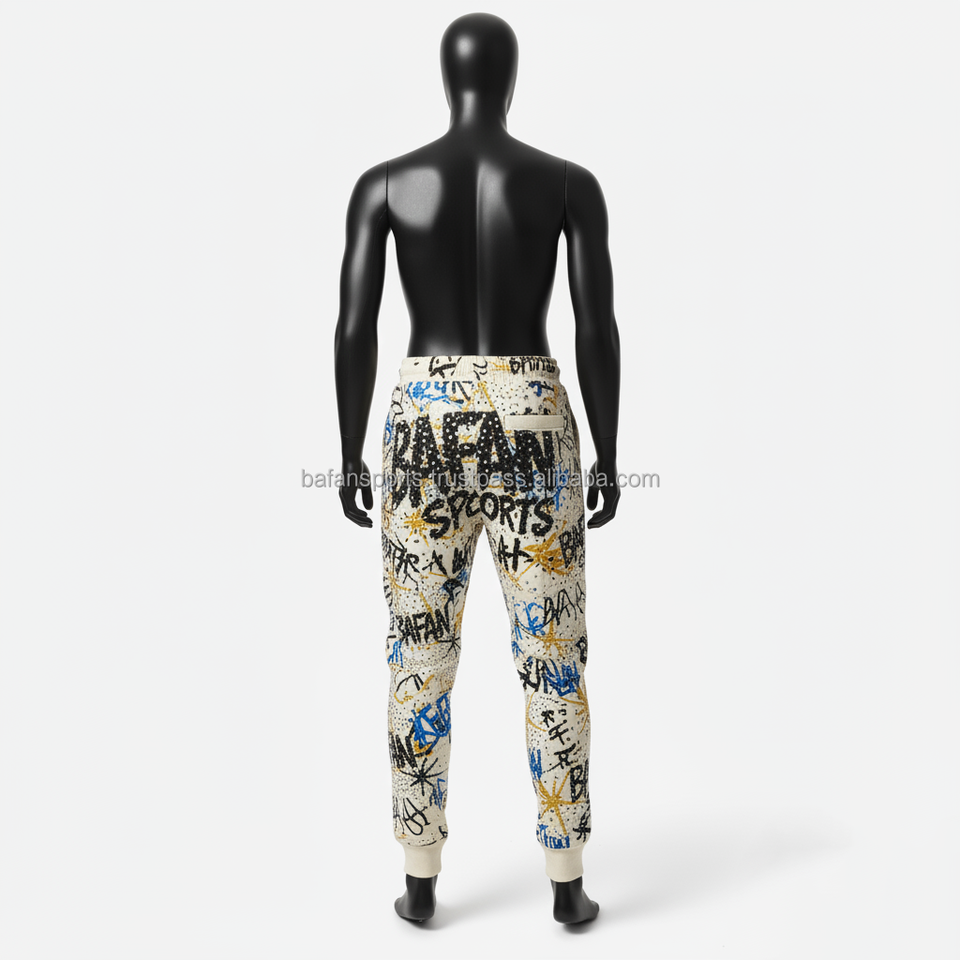 กางเกงวิ่งขายาวสำหรับผู้ชายกางเกงผ้าฟลีซเนื้อนุ่มพิมพ์ลายกราฟฟิตี้มีสไตล์ผ้ามีหัวเข่าระบายความร้อนออกแบบโลโก้ได้ตามต้องการ