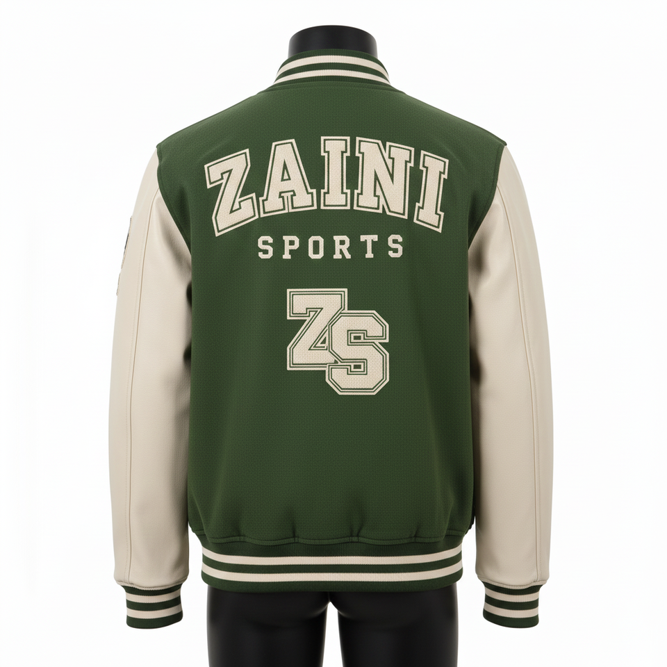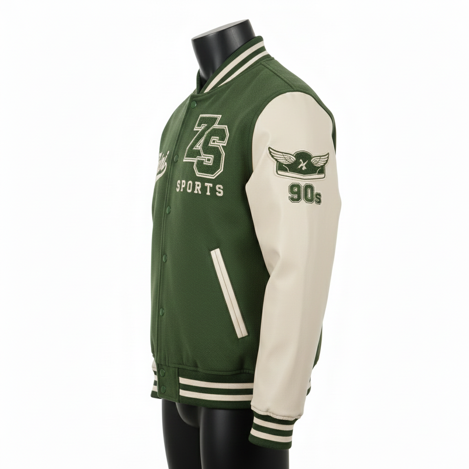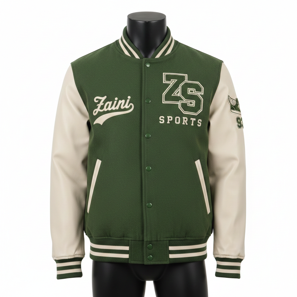 แจ็คเก็ตวาร์ซิตี้ผู้ชายคุณภาพสูง ผ้าขนสัตว์ 320GSM แขนหนัง PU สีเขียวครีม แผ่นตัดสีตัดกัน แจ็คเก็ตวาร์ซิตี้แบบกำหนดเองด้วยผ้าเชนิลล์