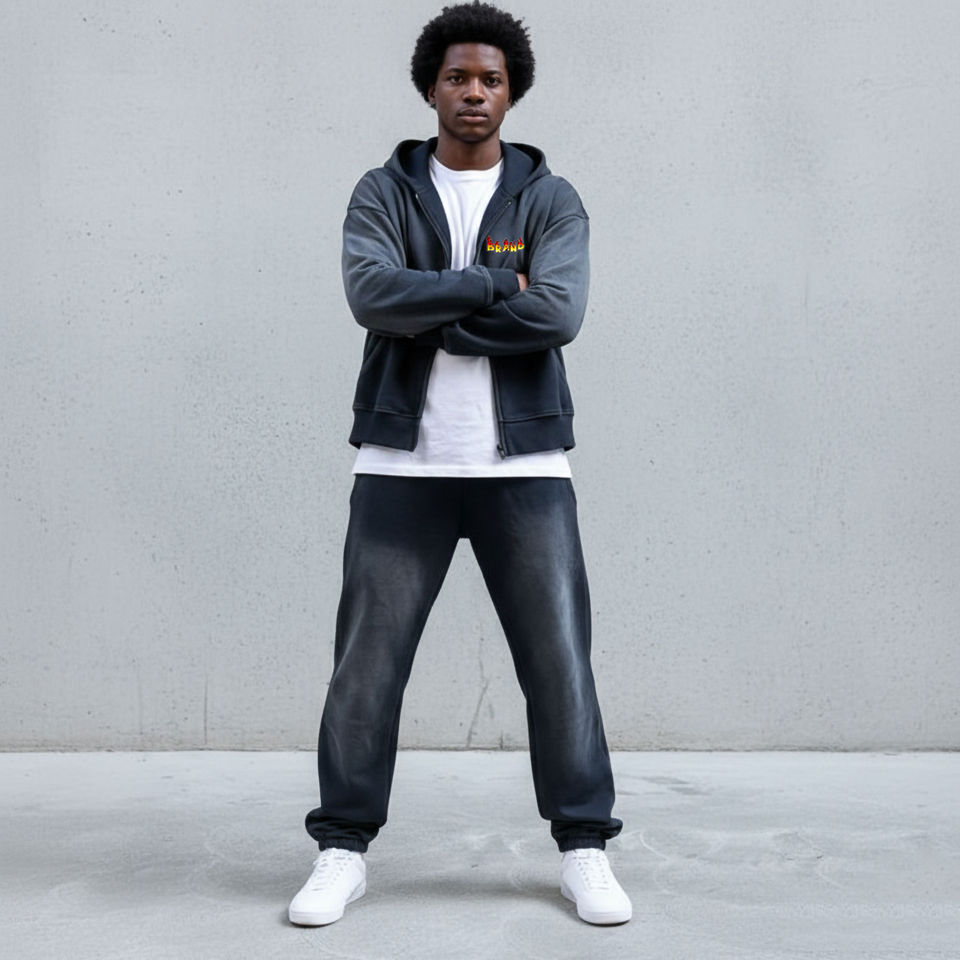ชุดเซ็ต 2 ชิ้น คุณภาพสูงสำหรับผู้ชาย ผ้าฟลีซคอตตอน 100% ล้างสีซีดแบบซันเฟด พิมพ์โลโก้ตามสั่ง เสื้อฮู้ด สตรีทแวร์ ฮิปฮอป แทรคสูท