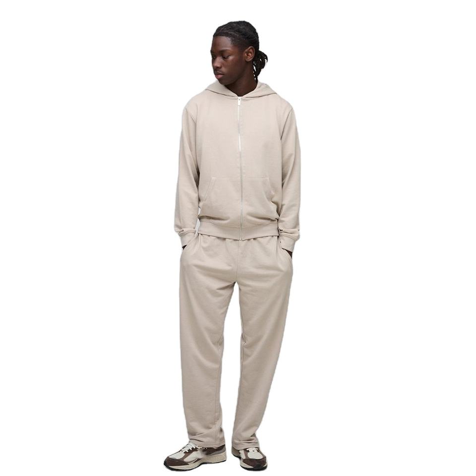 ชุดวอร์มผ้าคอตตอนเนื้อนุ่ม2ชิ้นสำหรับผู้ชายมีฮู้ดแบบรูดซิปสีเบจและกางเกงสำหรับวิ่งใส่สบาย