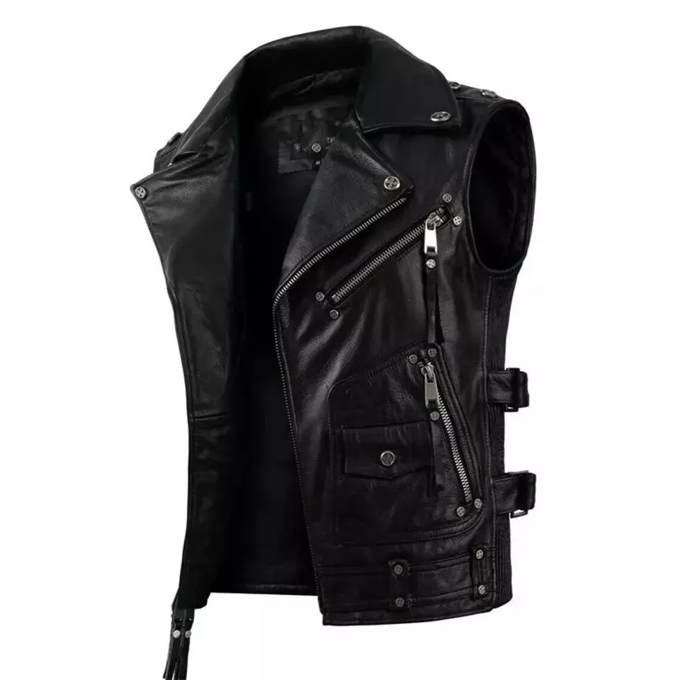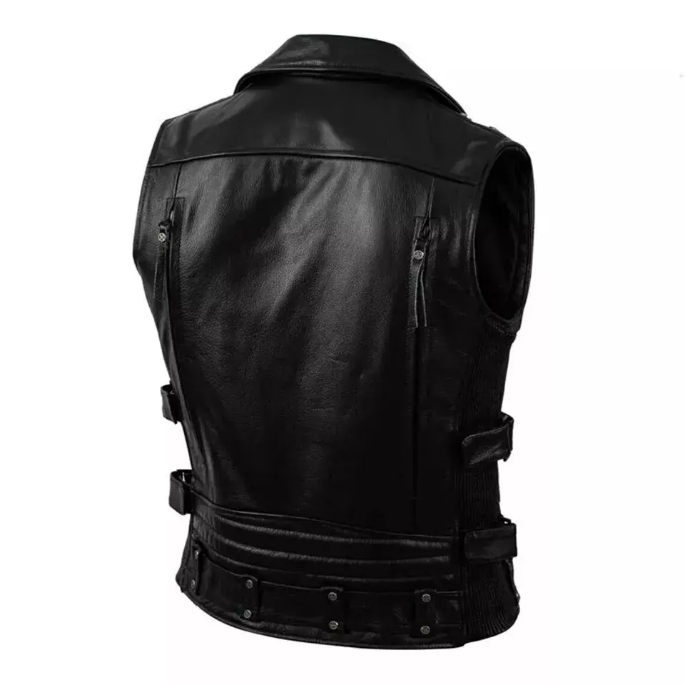 เสื้อกั๊กหนังแกะรัดรูปสำหรับผู้ชายเสื้อสีดำมอเตอร์ไซค์สไตล์วินเทจ
