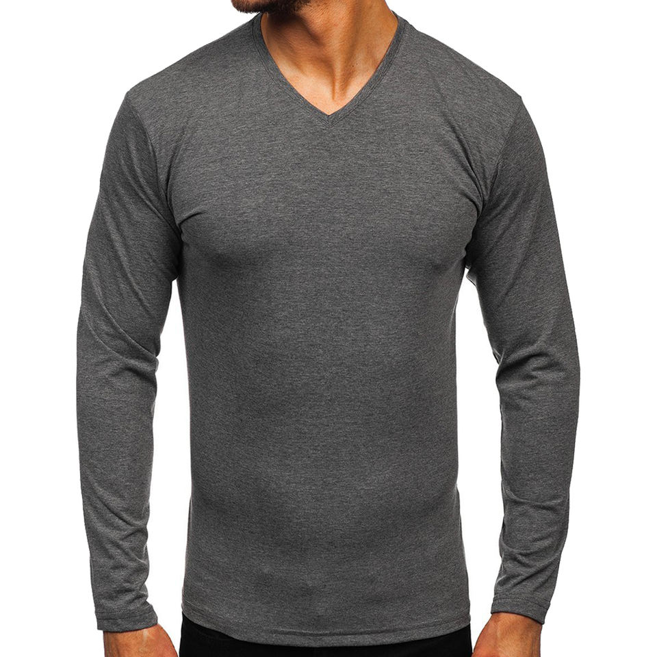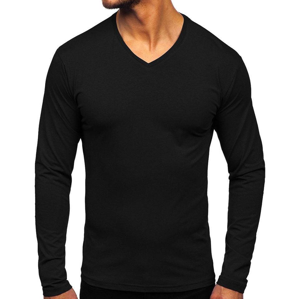 เสื้อยืดคอวีลำลองสำหรับผู้ชายแขนยาวสีดำลายพื้นย้อมสีล้วนมีหลายแพ็ค