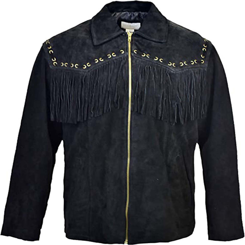 แจ็กเก็ตคาวบอยผู้ชายคุณภาพสูงหนังกลับหนังวัวสีดำ | เสื้อคลุมหนังแท้ประดับลูกปัดสไตล์ตะวันตก
