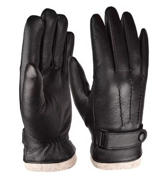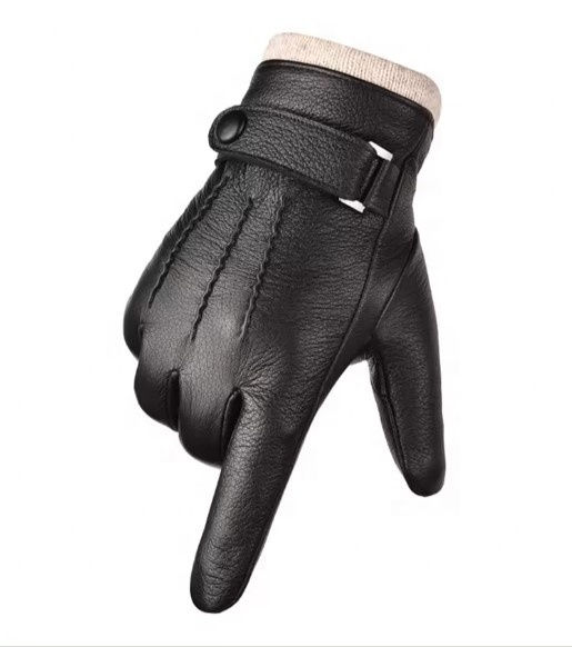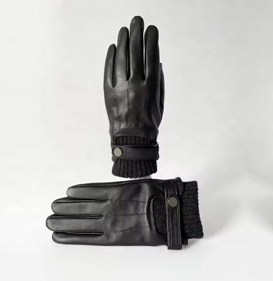 ถุงมือหนังแท้คุณภาพสูงสำหรับผู้ชาย ถุงมือขับรถหนังแกะสีดำบุขนสัตว์อุ่นสำหรับฤดูหนาว พร้อมสายรัดข้อมือปรับได้