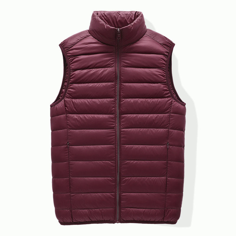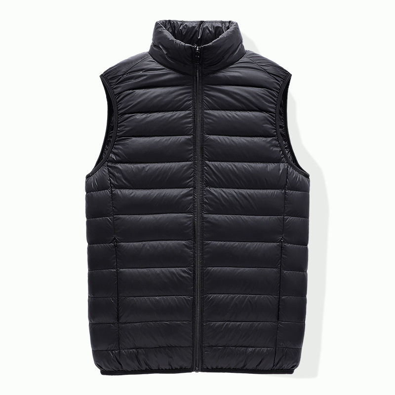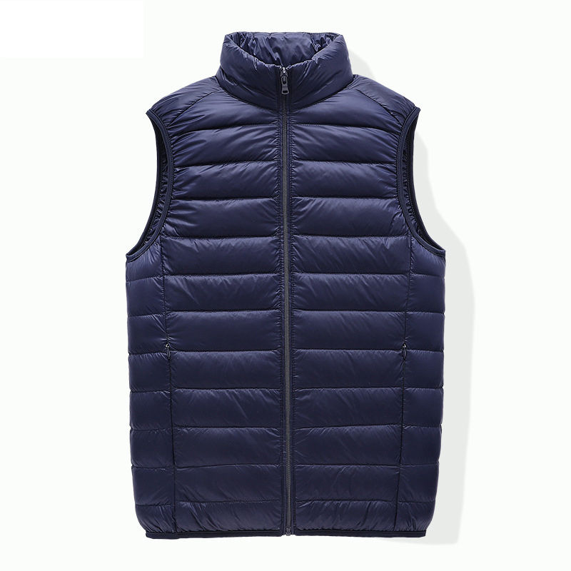 เสื้อกั๊กขนเป็ดน้ำหนักเบาของผู้ชายแจ็กเก็ตอุ่นคอตั้งเสื้อแขนกุดสำหรับฤดูหนาวกลางแจ้งชุดลำลองผ้าไนลอนเคลือบผิวด้านนอก
