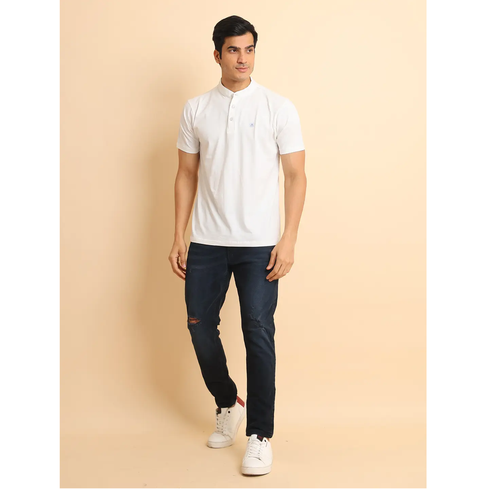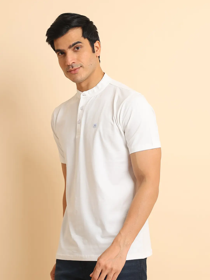 เสื้อยืดแขนครึ่งปกคอจีนสำหรับผู้ชายเสื้อใส่สบายเนื้อผ้าคอตตอน100% ใส่ได้ทุกวัน