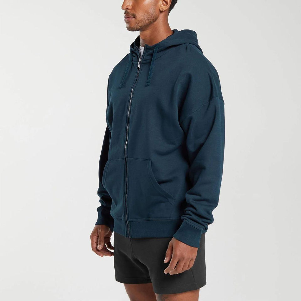เสื้อฮู้ดดี้ผู้ชายคุณภาพสูง ไซส์ใหญ่ ซิปหน้า ผ้าฝ้ายฟลีซหนานุ่ม สีดำแบบกำหนดเอง แบบซิปเต็มตัว