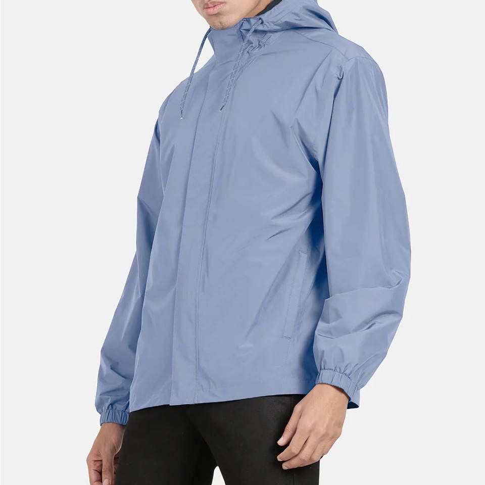 แจ็กเก็ตกันฝนของผู้ชายปกเสื้อมีฮู้ดสีพิเศษพร้อมกระเป๋าตกแต่ง