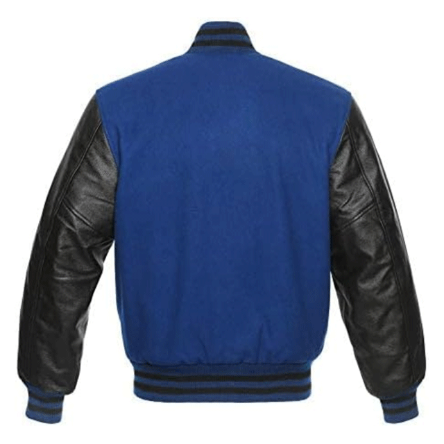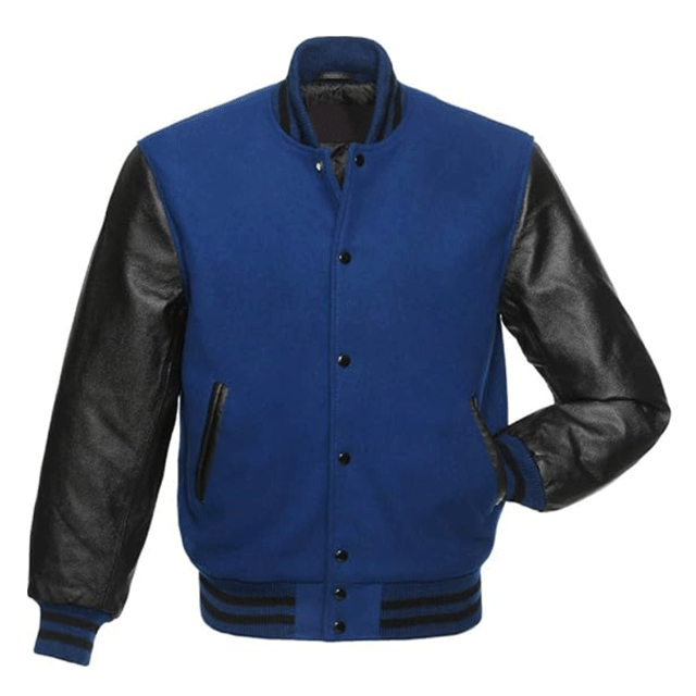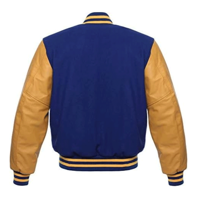 เสื้อแจ็คเก็ตบอมเบอร์วาร์ซิตี้ผู้ชายคุณภาพสูง สีน้ำเงินรอยัล ทำจากขนแกะเคลือบทอง แขนเสื้อหนังแกะ กันลม
