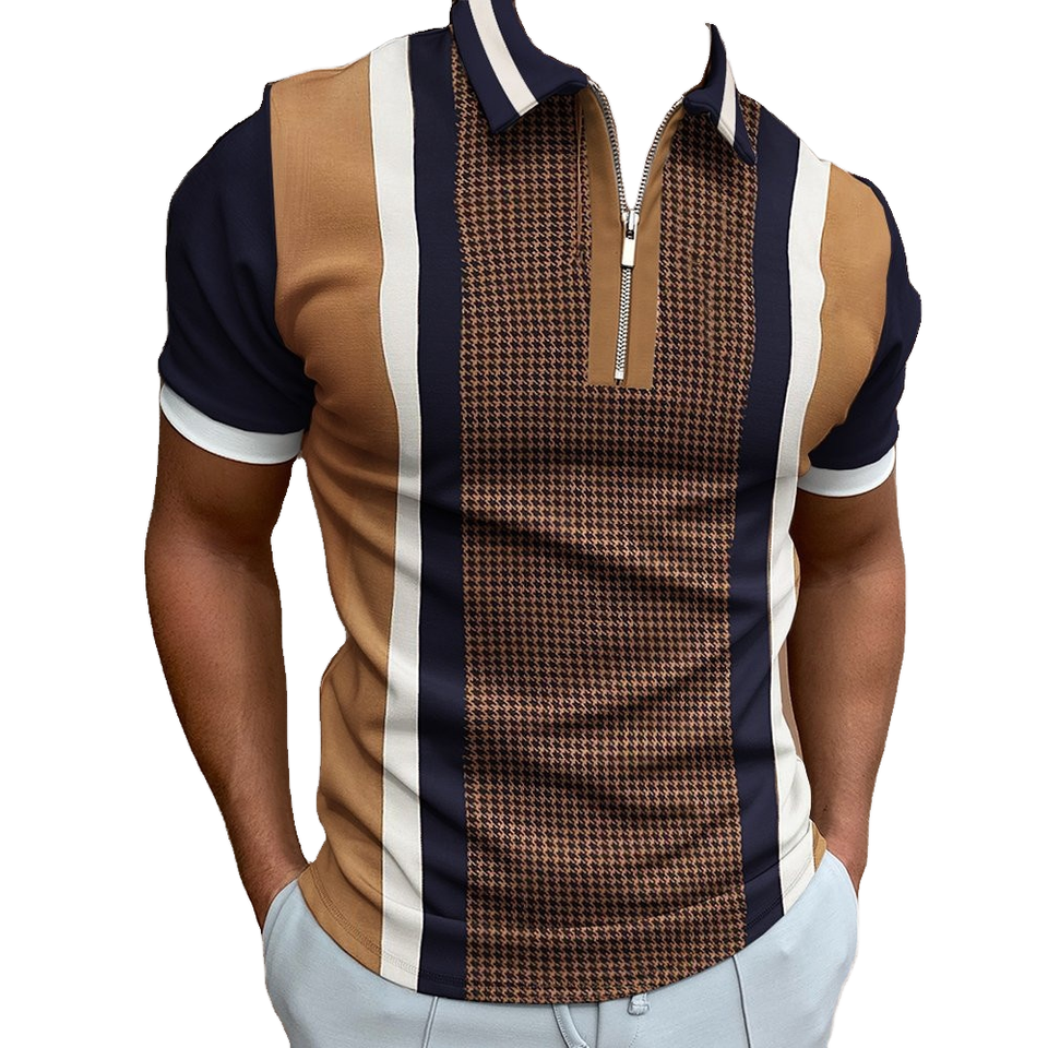 เสื้อผู้ชายแขนสั้นลายทางพิมพ์ดิจิตอลมีซิปตกแต่ง100% ผ้าโพลีเอสเตอร์แห้งเร็ว