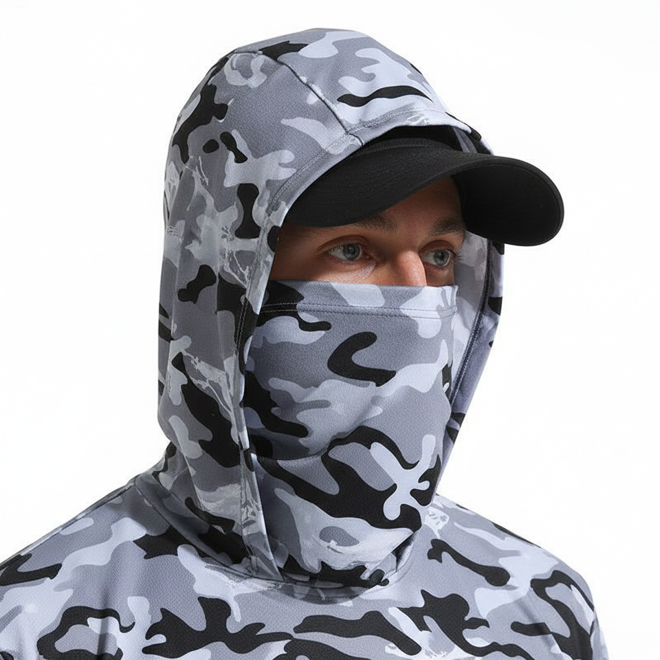 เสื้อตกปลาแขนยาวมีฮู้ดสำหรับผู้ชาย คุณภาพสูง ผลิตจากผ้าสแปนเด็กซ์/โพลีเอสเตอร์ ป้องกันแสงแดด UPF 50 พิมพ์ลายได้ตามต้องการ แห้งเร็ว ระบายอากาศได้ดี