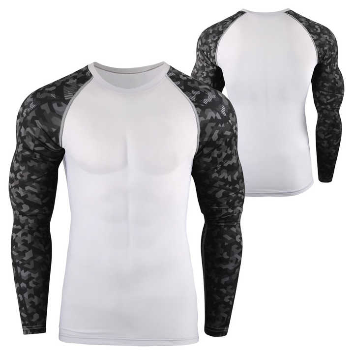 เสื้อรัดรูปสแปนเด็กซ์พิมพ์ลายซับลิเมชันของผู้ชายเสื้อรัดรูปสำหรับเล่นเซิร์ฟดำน้ำ100% ดีไซน์ดีขายส่งใหม่