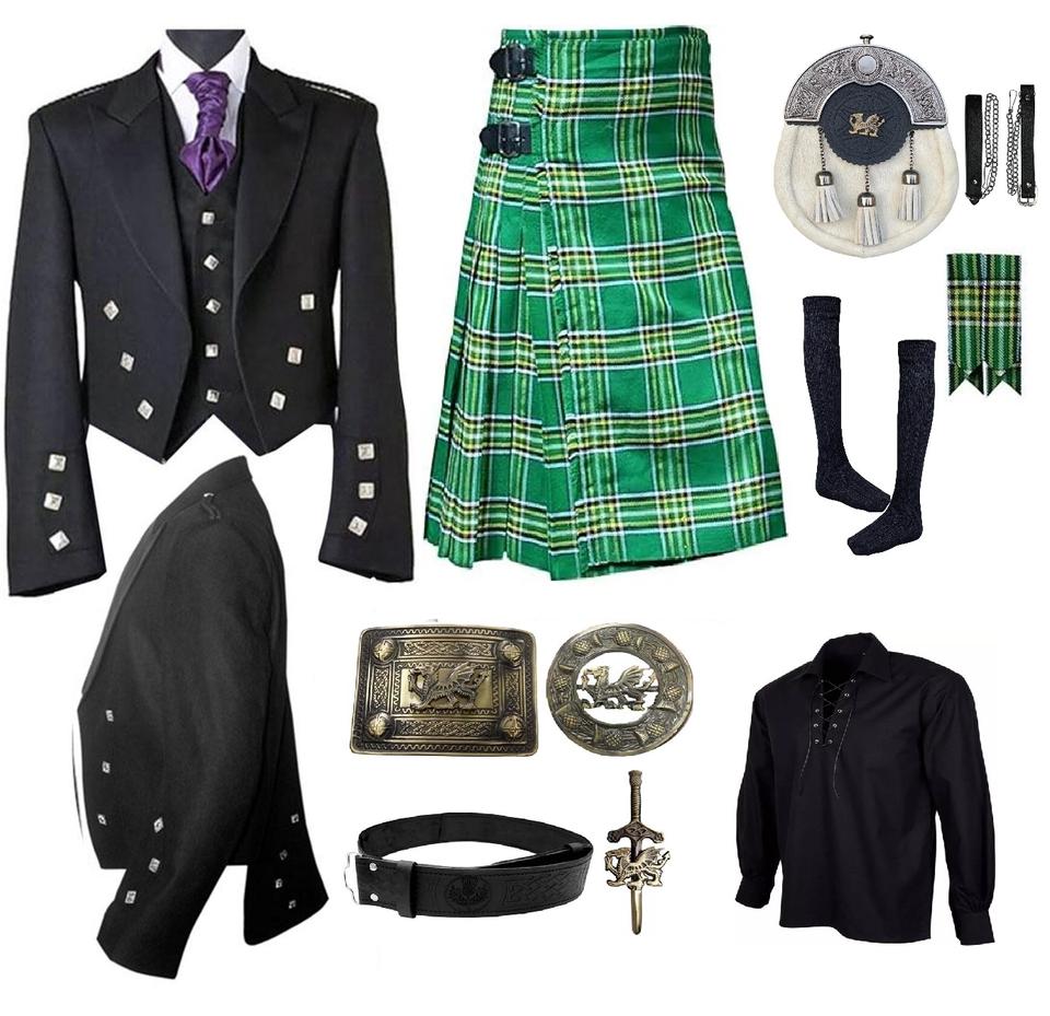 ชุดกระโปรงลายตารางของผู้ชายชุดกระโปรงผ้าลายสก็อตสีเทาแบบดั้งเดิมอุปกรณ์เสริมเครื่องดนตรีทำจากขนสัตว์
