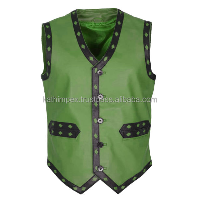 เสื้อกั๊กหนังสีเขียวคอวีของผู้ชายมีกระดุมปิดแบบมีเขาระบายความร้อน
