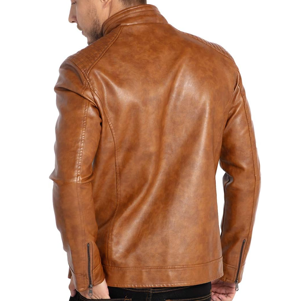 แจ็กเก็ตหนังขี่มอเตอร์ไซค์แบบคอตั้งสไตล์วินเทจของผู้ชายหนังเทียม