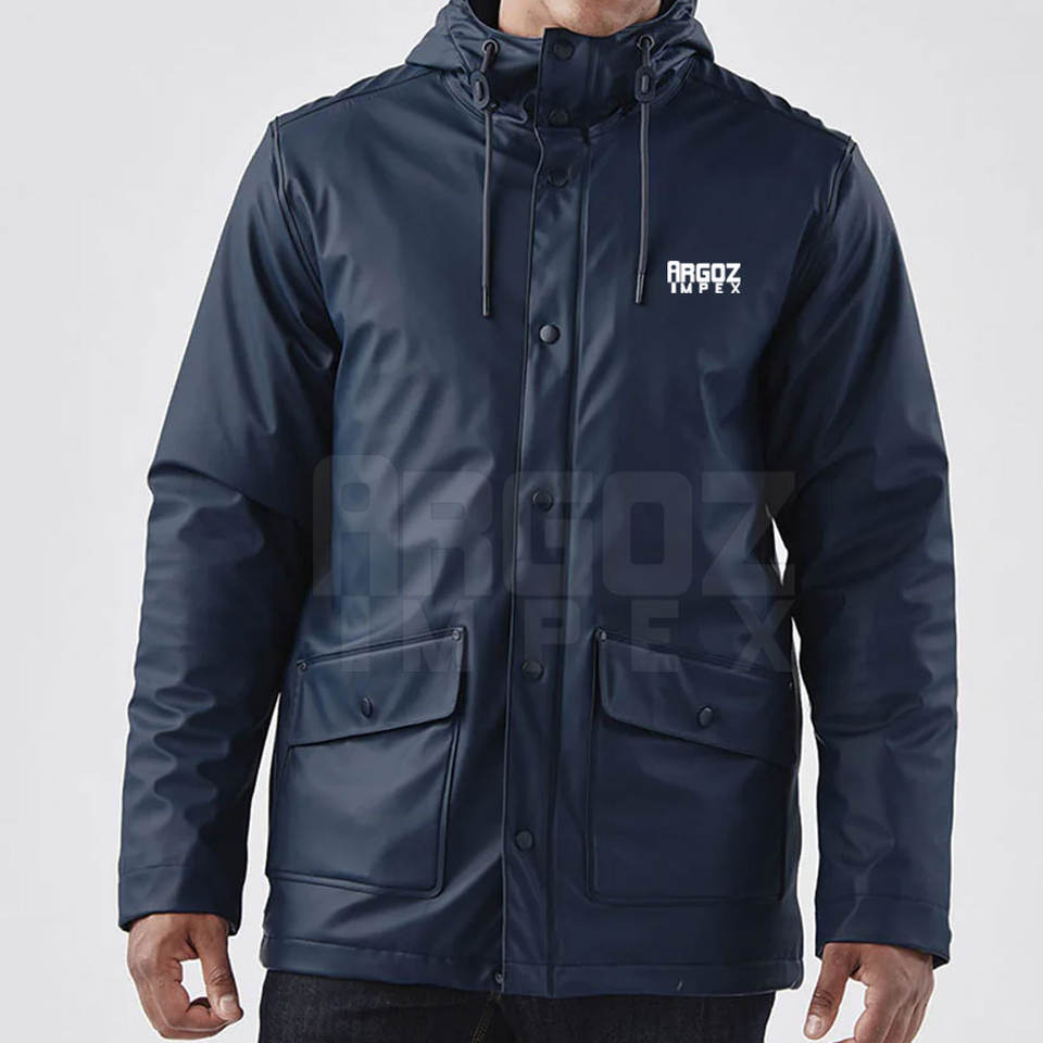 เสื้อกันฝนผู้ชายคุณภาพสูงสำหรับฤดูหนาว บริการ OEM ผลิตตามสั่ง คอเสื้อมีฮู้ด โลโก้ด้านหน้า แห้งเร็ว ระบายอากาศได้ดี ขายตรงจากโรงงาน