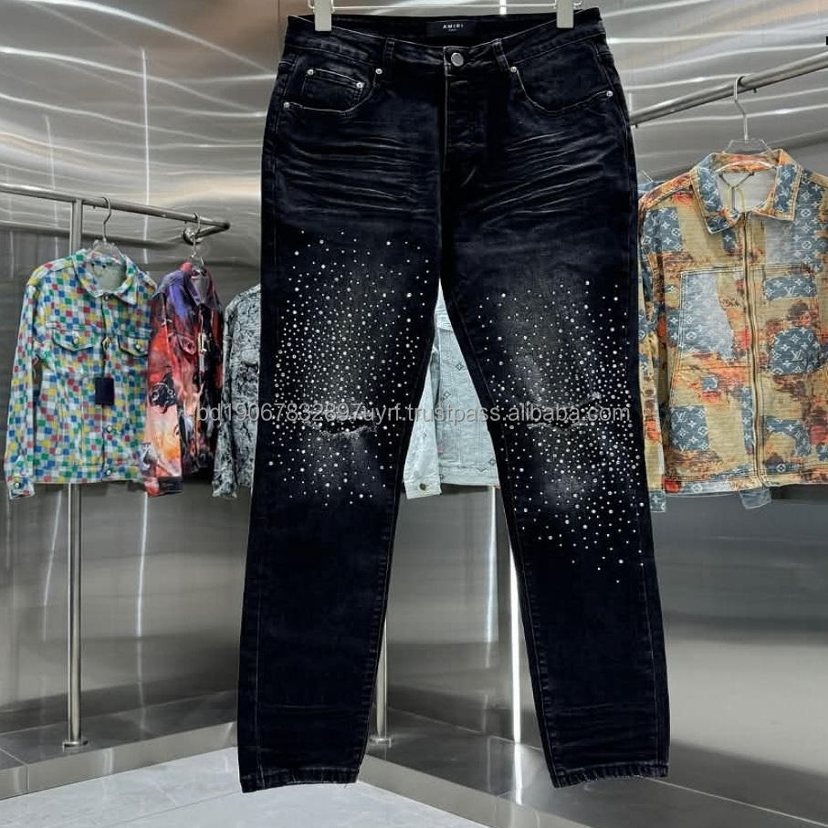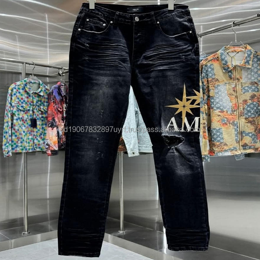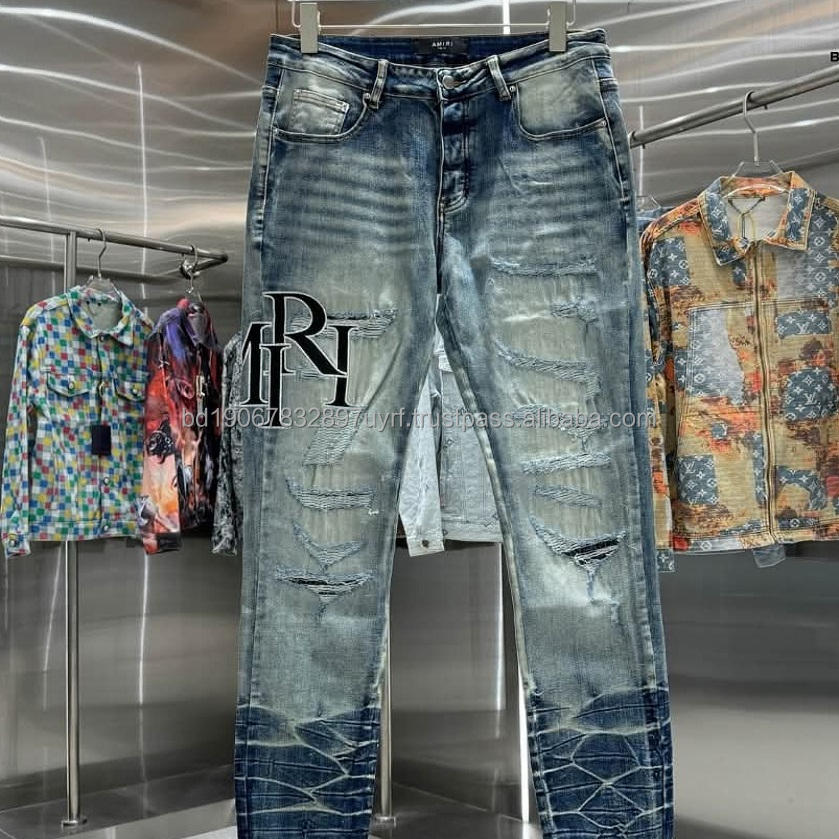 กางเกงยีนส์ผู้ชายเอวสูงรัดรูปคุณภาพสูงกางเกงสตรีทแบบลำลองผ้าเดนิมแบบขาดๆผ้าฝ้ายฟอกสีสีฟ้าสำหรับฤดูใบไม้ผลิฤดูใบไม้ร่วง