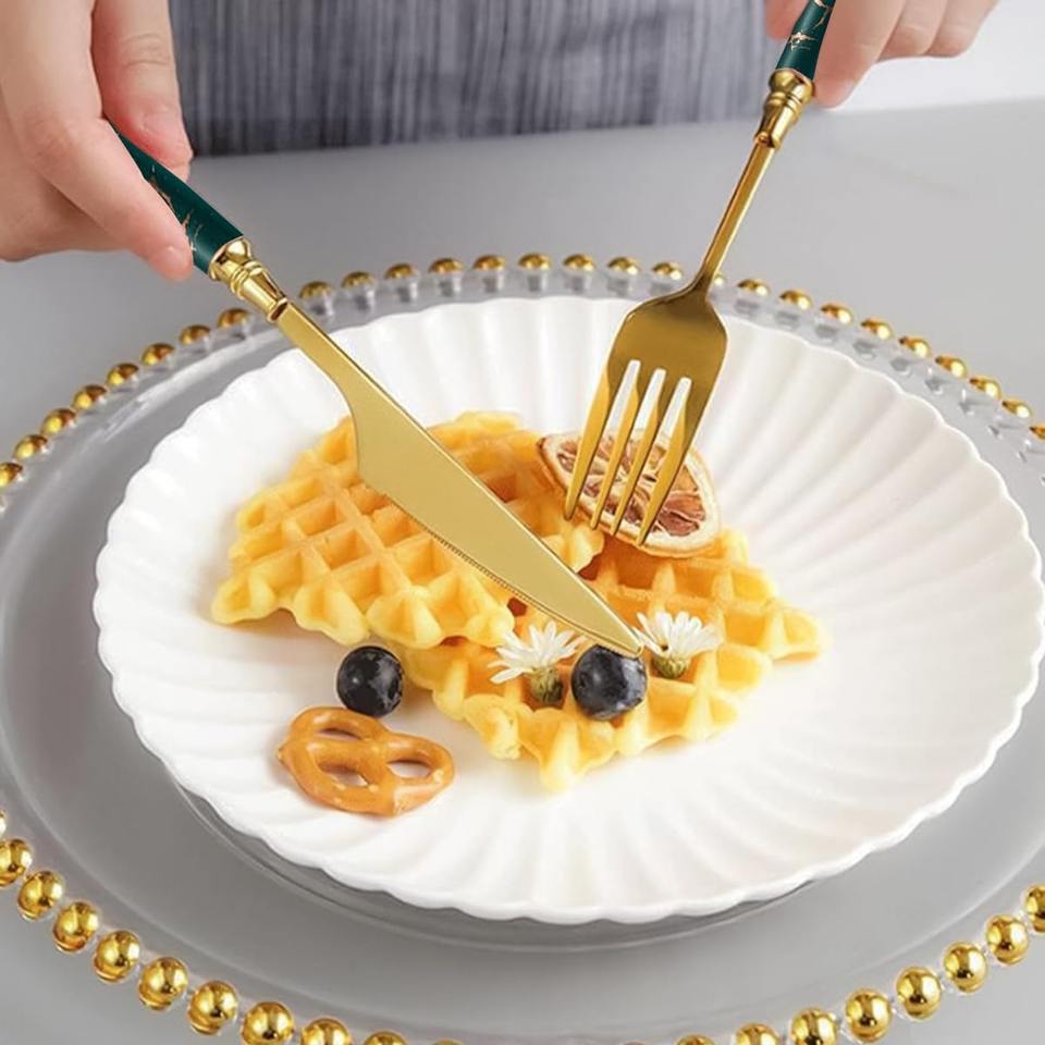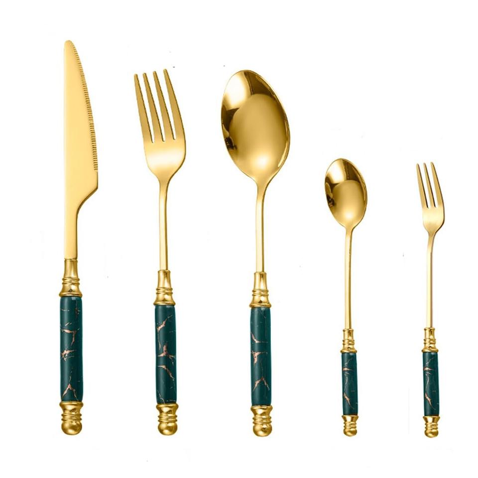 ชุดช้อนส้อมหินอ่อนสีเขียวหรูหราพร้อมหัวทอง เหมาะสำหรับงานเลี้ยงครอบครัว การต้อนรับแขก และการให้เป็นของขวัญ จากอินเดีย