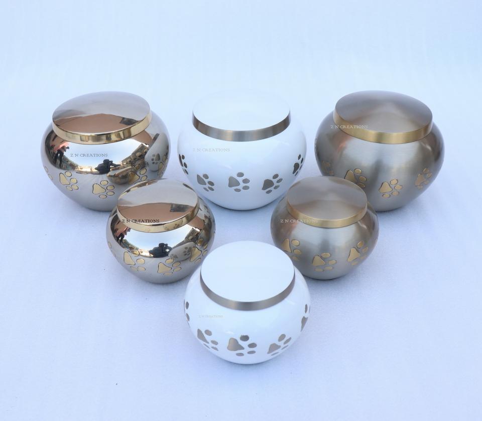 โกศใส่เถ้ากระดูกสัตว์เลี้ยงคุณภาพสูง ดีไซน์ทันสมัย ทำจากทองเหลือง พร้อมลวดลายสลักนิกเกิลเงางาม สำหรับเก็บเถ้ากระดูก