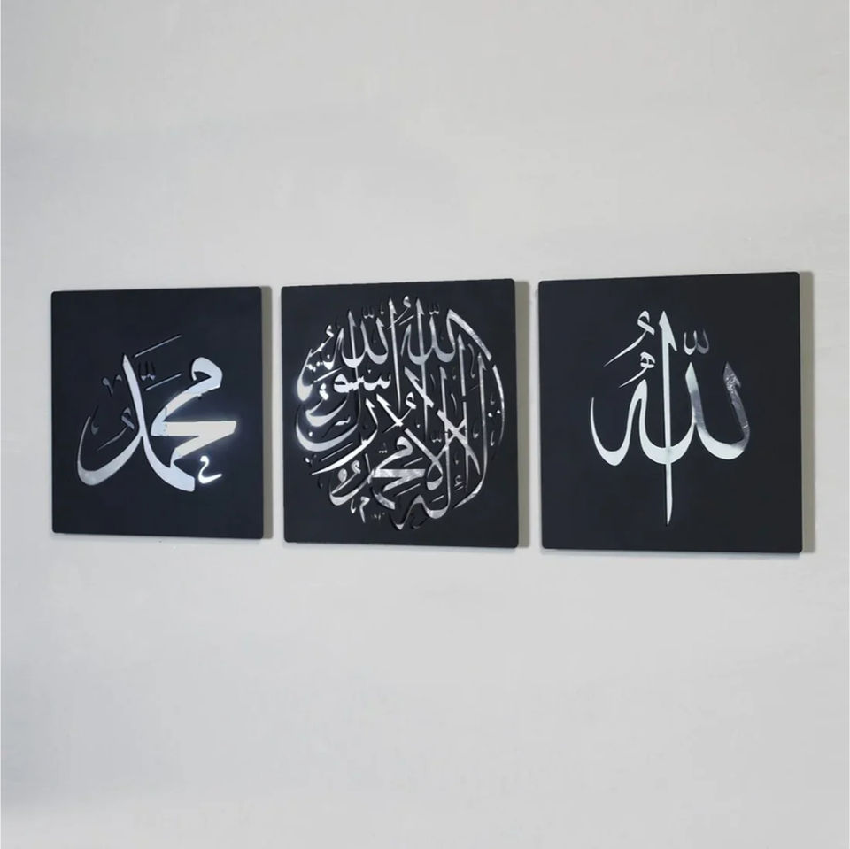 งานศิลปะติดผนังโลหะสีดำคุณภาพสูง ดีไซน์ทันสมัย ปรับแต่งได้ ลายอักษรอิสลามแบบเลเซอร์คัท อัลเลาะห์ มูฮัมหมัด ภาษาอาหรับ ของขวัญรอมฎอนและอีด